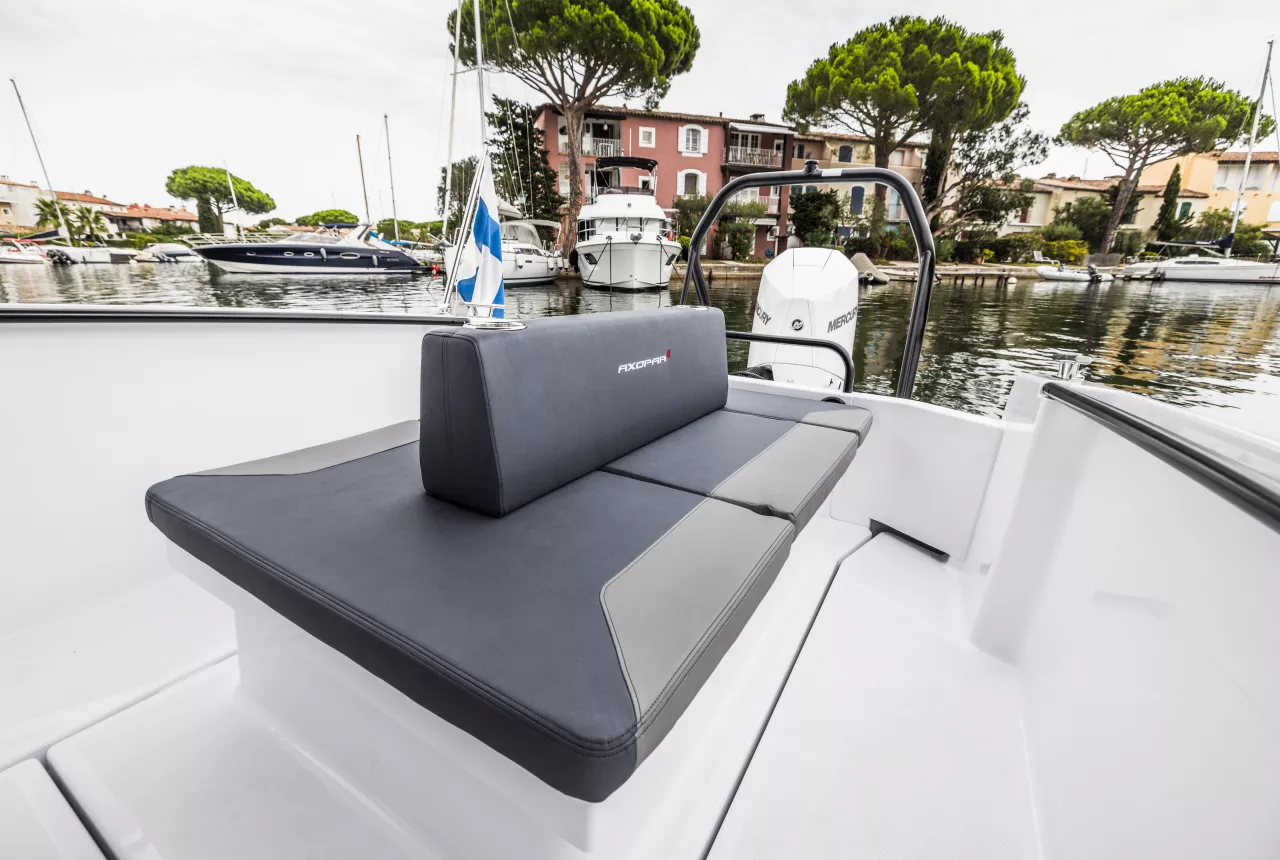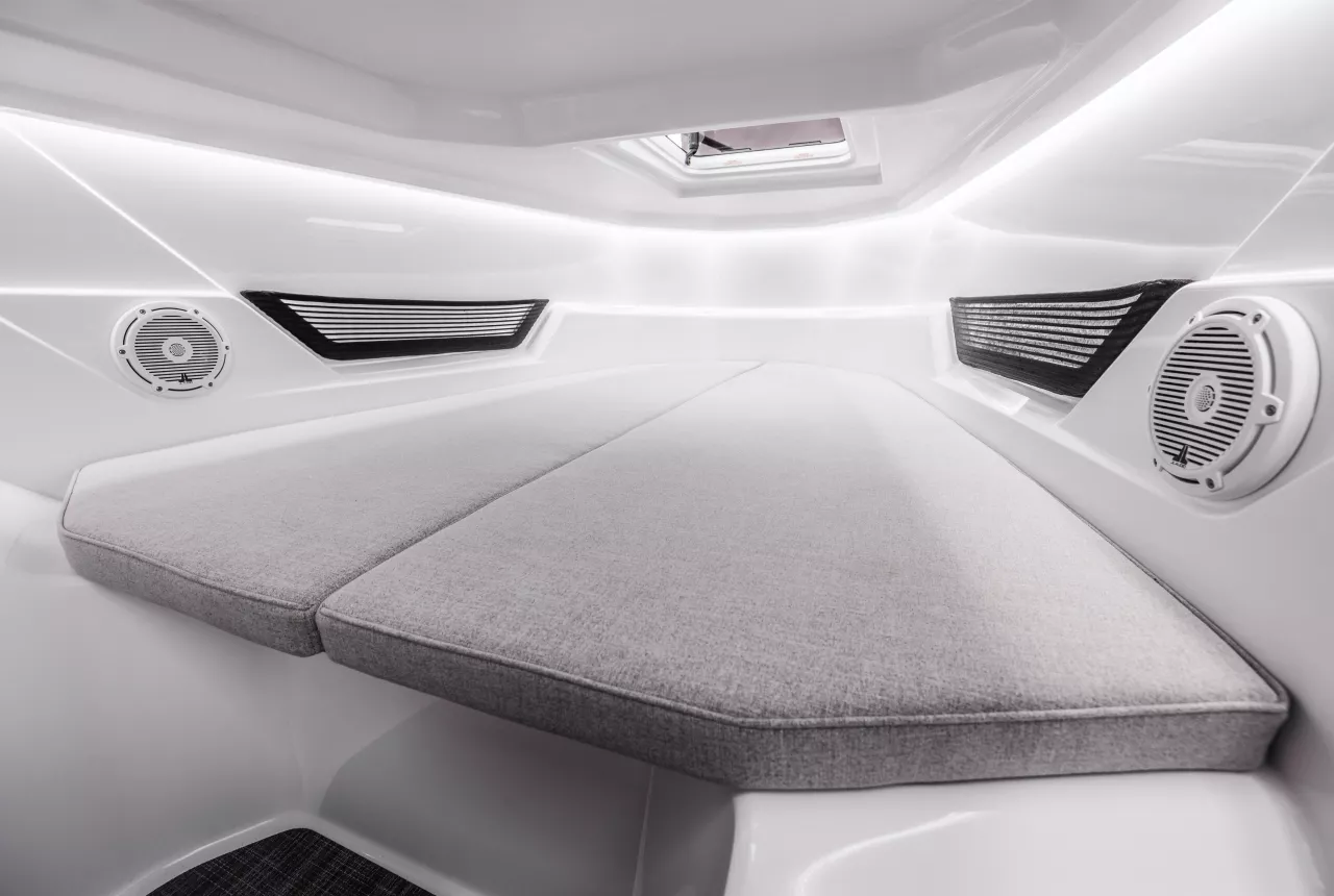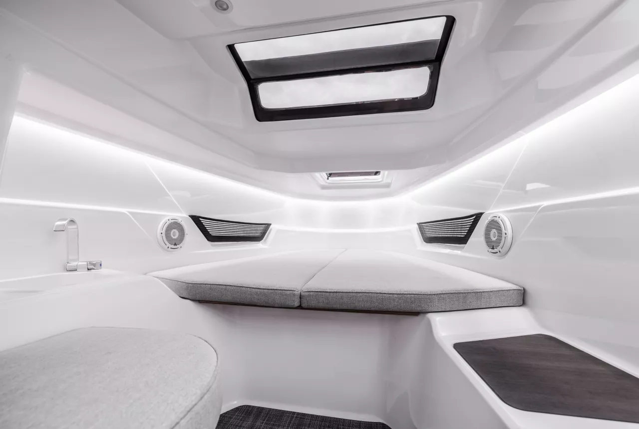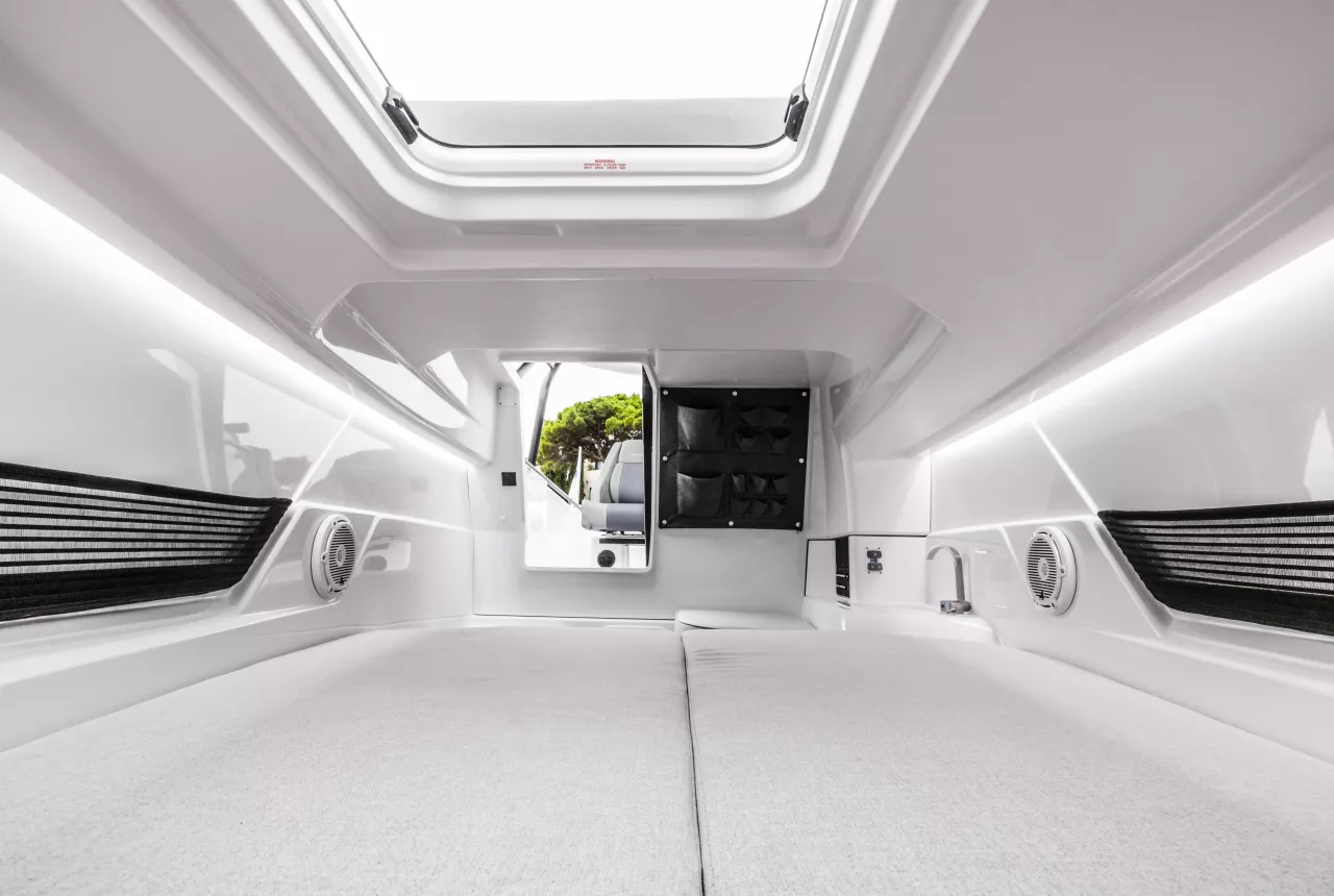 Die ultra-coole Axopar 25 Cross Top verfügt über eine erhöhte „Cuddy Cabin”-Schlafkabine, die den Charakter dieses bemerkenswerten neuen Bootes prägt. Auf dem Kabinendach befindet sich ein gepolstertes Sonnendeck in voller Breite mit einer schrägen Rückenlehne, die der Neigung der Frontscheibe folgt. Die breite Steuerkonsole und die Frontscheibe bieten einen Steuerstand mit mehr Platz und Raum für einen Durchgang zur vorderen Kabine, ähnlich wie bei anderen größeren Axopar-Modellen.