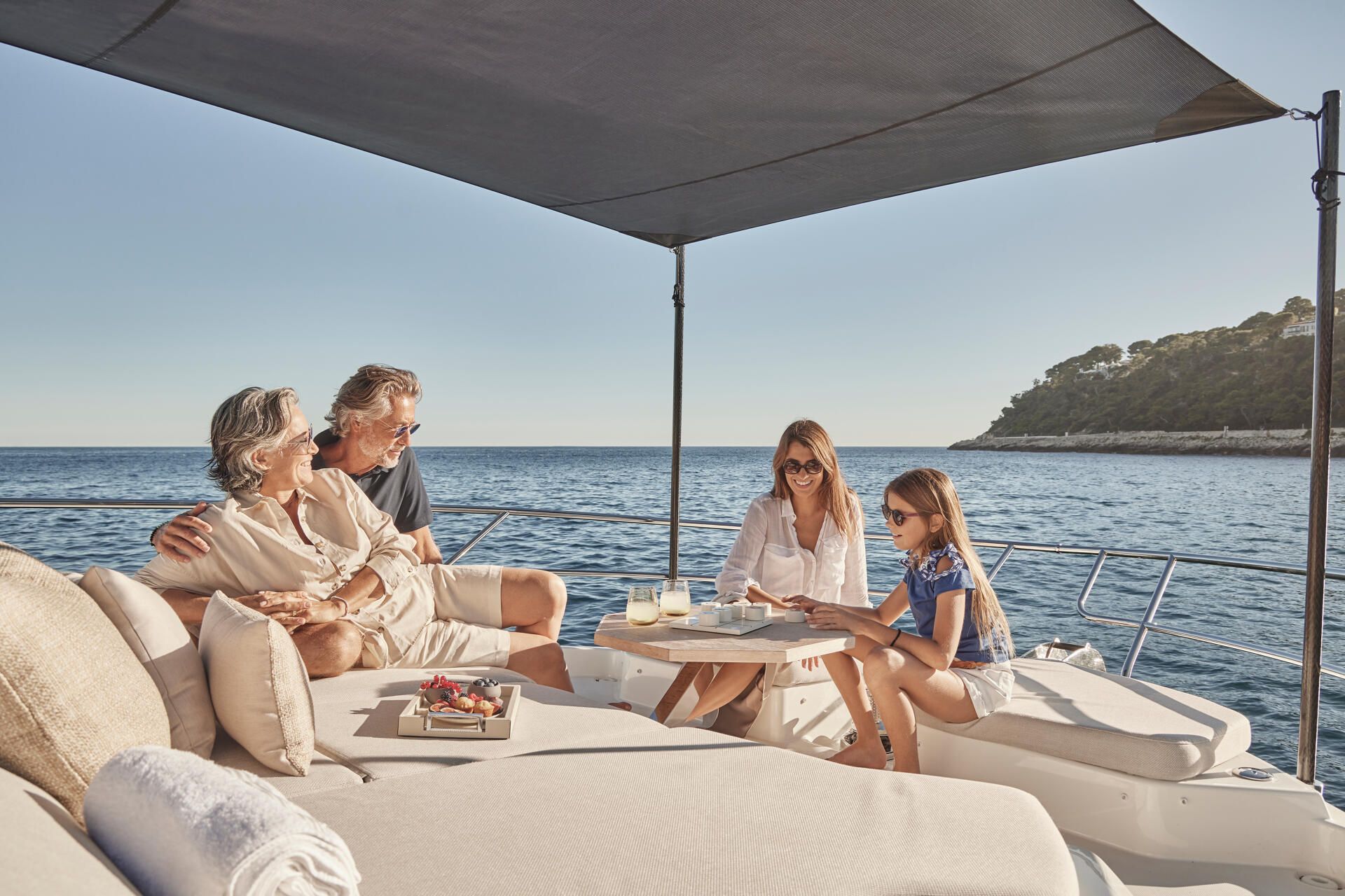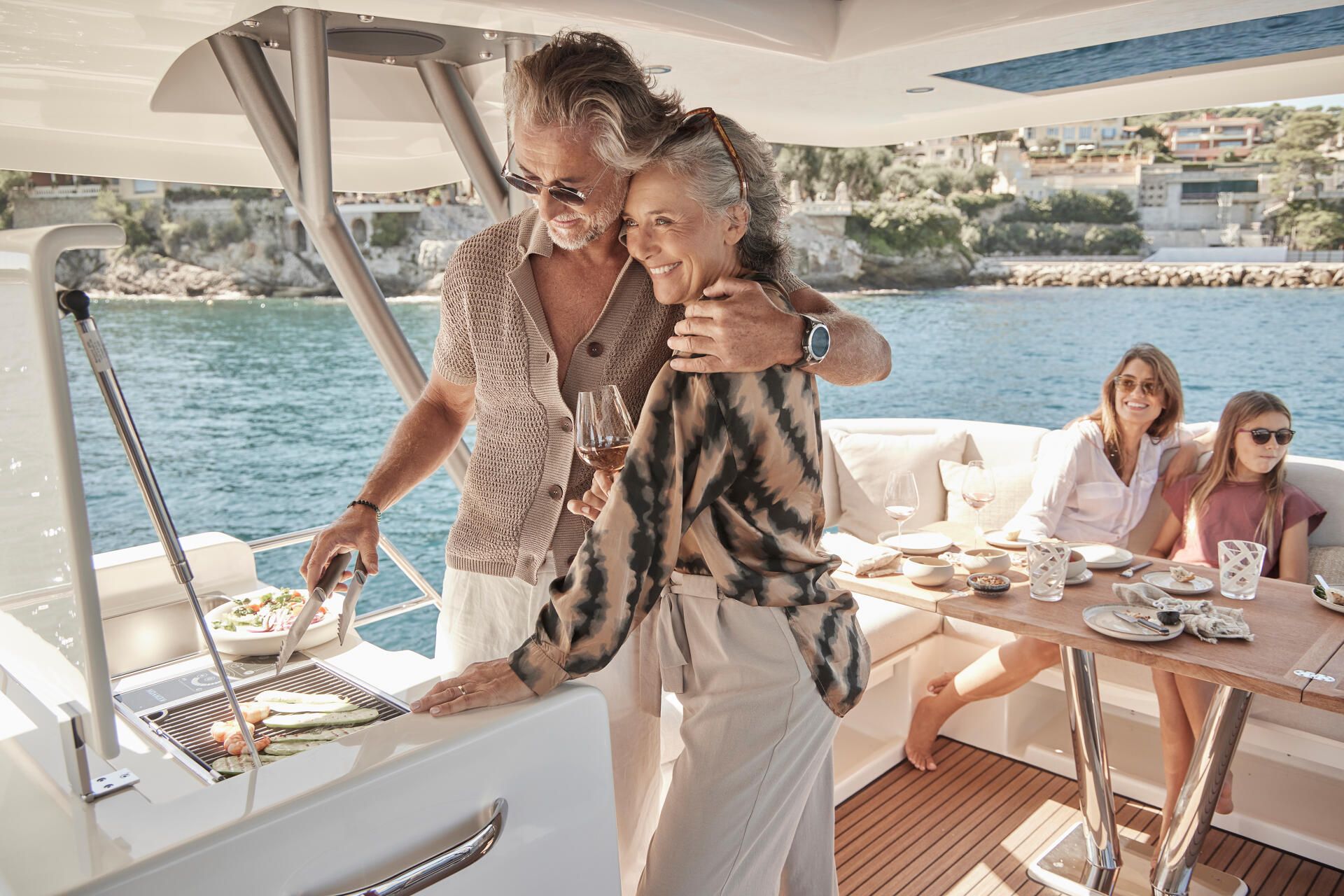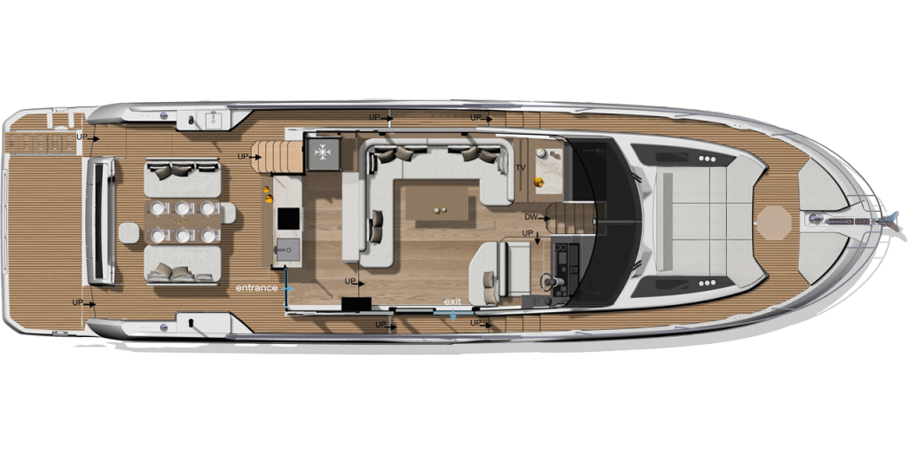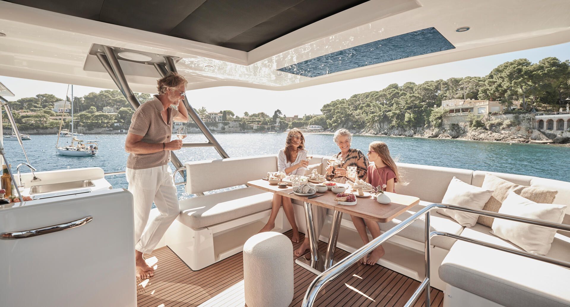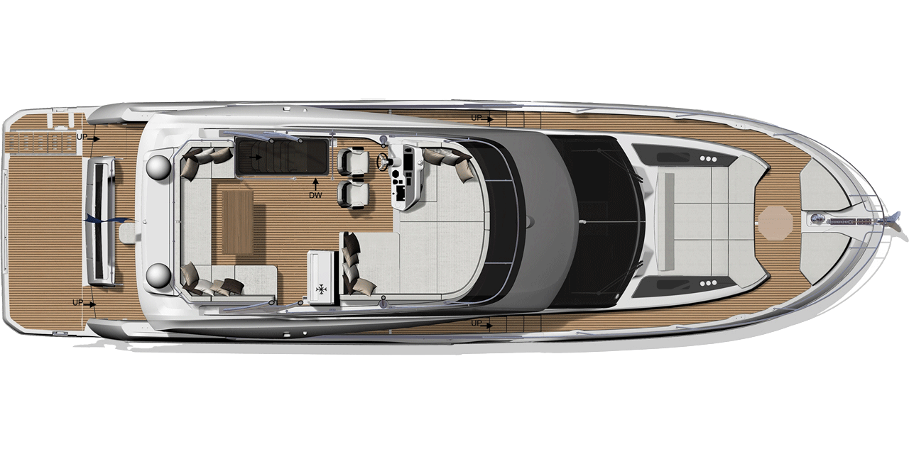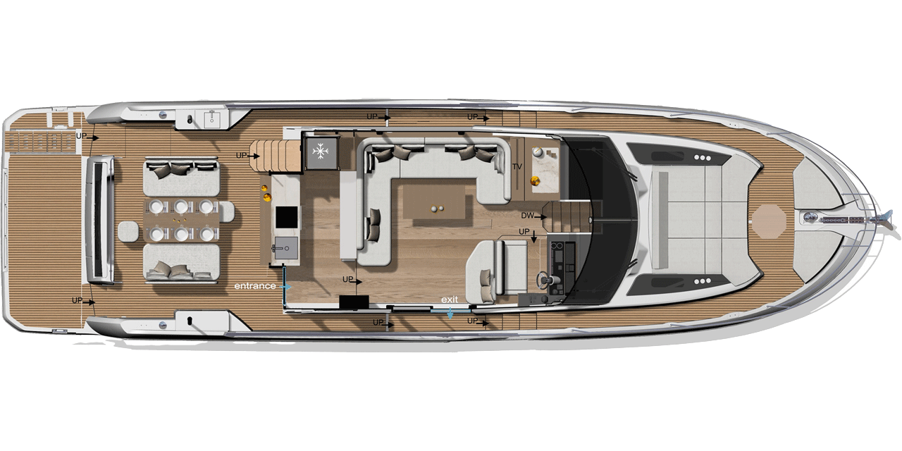 DIE X70, ENTWICKELT IM STIL DER SUPERYACHTEN, IST ZEITLOS. AUSSEN UND INNEN GEHEN NAHTLOS INEINANDER ÜBER Außen und Innen gehen nahtlos ineinander über. Viel Platz, Bewegungsfreiheit und Licht sorgen für eine einzigartige Erfahrung an Bord. Das geniale Konzept von diesem luxuriösen Crossover ermöglicht ein volles Ausnutzen der ganzen Breite der Yacht: Ergebnis ist unendlich viel Platz an Bord. Das Leben an Bord der X70 verbindet den Komfort einer Luxusvilla mit dem Vergnügen eines Lebens auf dem Meer auf radikal neue Art.