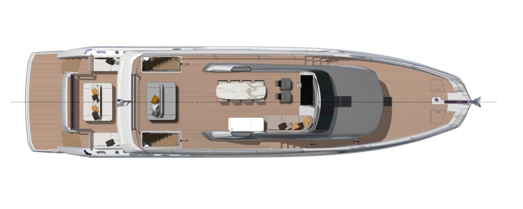 DIE X70, ENTWICKELT IM STIL DER SUPERYACHTEN, IST ZEITLOS. AUSSEN UND INNEN GEHEN NAHTLOS INEINANDER ÜBER Außen und Innen gehen nahtlos ineinander über. Viel Platz, Bewegungsfreiheit und Licht sorgen für eine einzigartige Erfahrung an Bord. Das geniale Konzept von diesem luxuriösen Crossover ermöglicht ein volles Ausnutzen der ganzen Breite der Yacht: Ergebnis ist unendlich viel Platz an Bord. Das Leben an Bord der X70 verbindet den Komfort einer Luxusvilla mit dem Vergnügen eines Lebens auf dem Meer auf radikal neue Art.