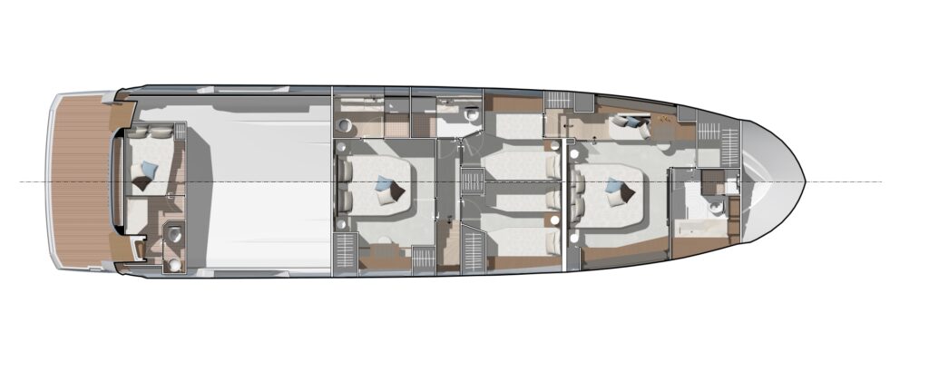 Die X70 wurde von Garroni Design im Stil großer Yachten entworfen und definiert das Konzept des Luxus-Crossovers neu, indem die Breite einer Yacht voll ausgenutzt wird. Sie bietet ein völlig barrierefreies Leben an Bord, das sich auf Volumen, Bewegung und Licht konzentriert. Genießen Sie den großzügigen Beach Club, bewundern Sie den Sonnenuntergang von der Flybridge aus, nehmen Sie einen Cocktail auf den bequemen Sofas im Salon oder speisen Sie am großen Tisch im hinteren Teil des Cockpits. Jeder Raum wurde sorgfältig gestaltet, um unvergessliche Momente mit Freunden oder mit der Familie zu erleben..